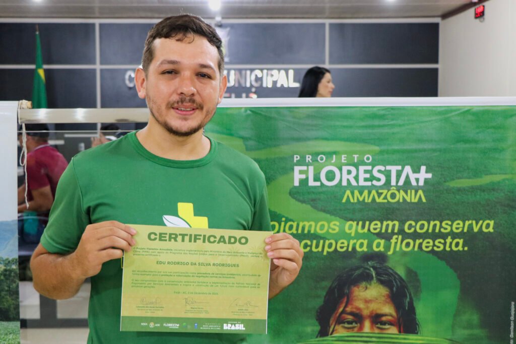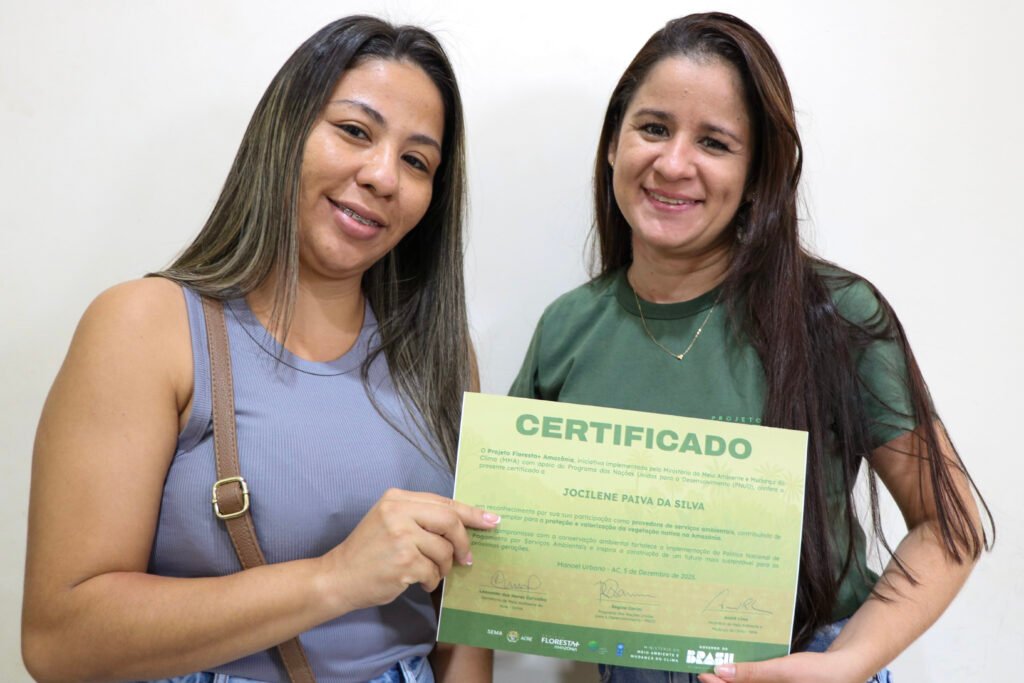 Em Manoel Urbano, 18 agricultores receberam certificação. Entre eles está Jocilene Silva, viúva e mãe de duas filhas, que ajustou o uso da propriedade para priorizar a conservação após conhecer o projeto. “No início eu ia desmatar a frente e deixar o fundo com mata. Quando soube do Floresta+, decidi não mexer. Foi perfeito! Recebo por conservar e posso investir nos estudos das minhas filhas”, relata.